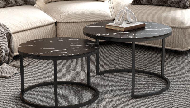 Ensemble de deux tables basses gigognes de style moderne et industriel. Ces tables se caractérisent par des plateaux ronds avec un effet marbre et des structures ouvertes en métal noir.