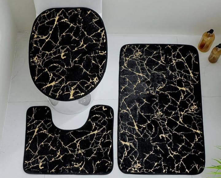 Ce tapis de bain de 3 pièces est orné d'un motif marbré avec des veines dorées. Il est en microfibre absorbante et est doté d'un revêtement antidérapant pour la sécurité. Il est très doux et offre un style moderne et élégant à votre salle de bain.