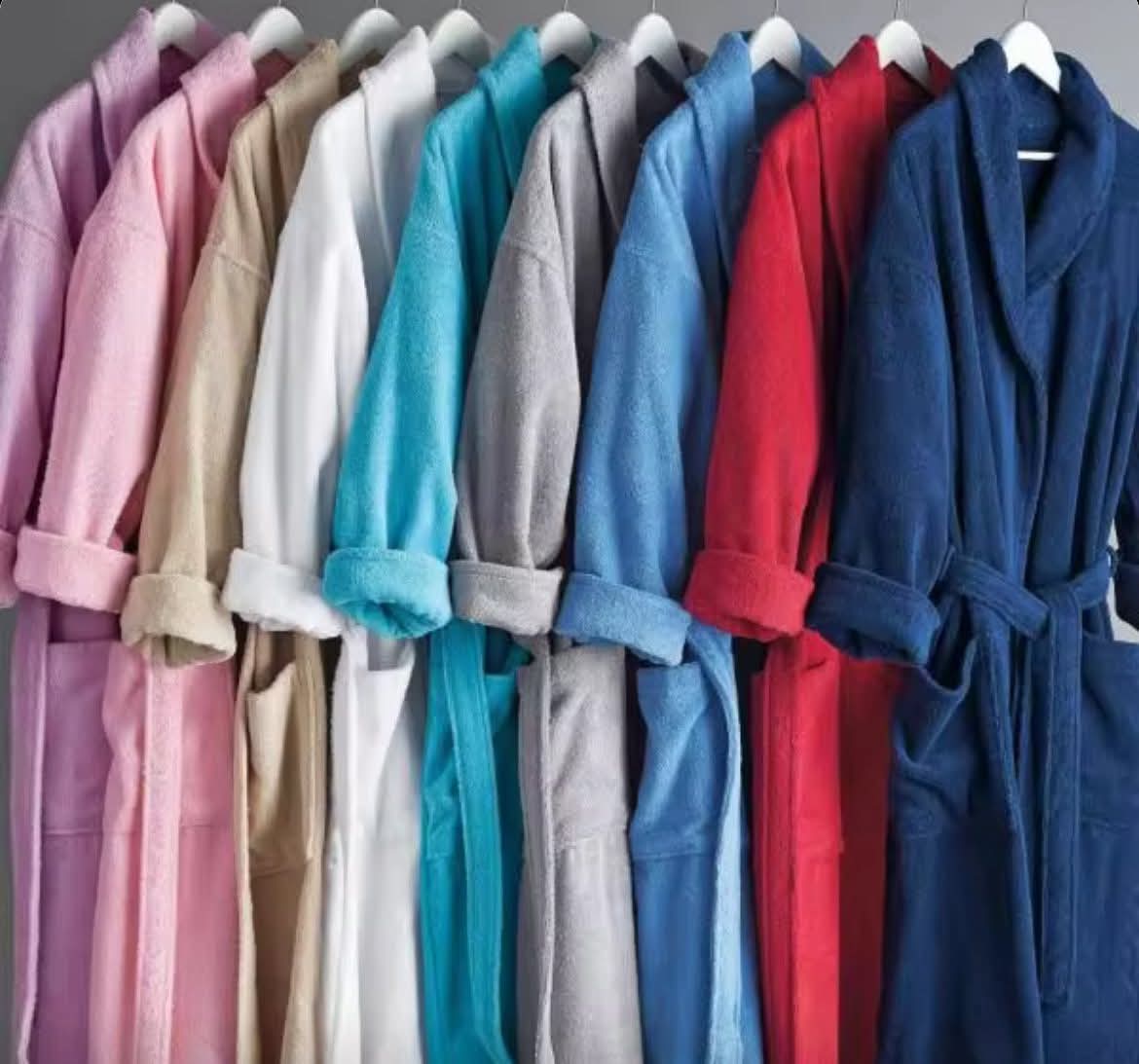 Peignoir de grande taille en tissu éponge ou douillette, disponibles en plusieurs couleurs.